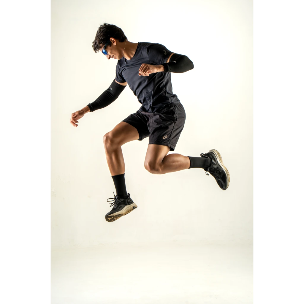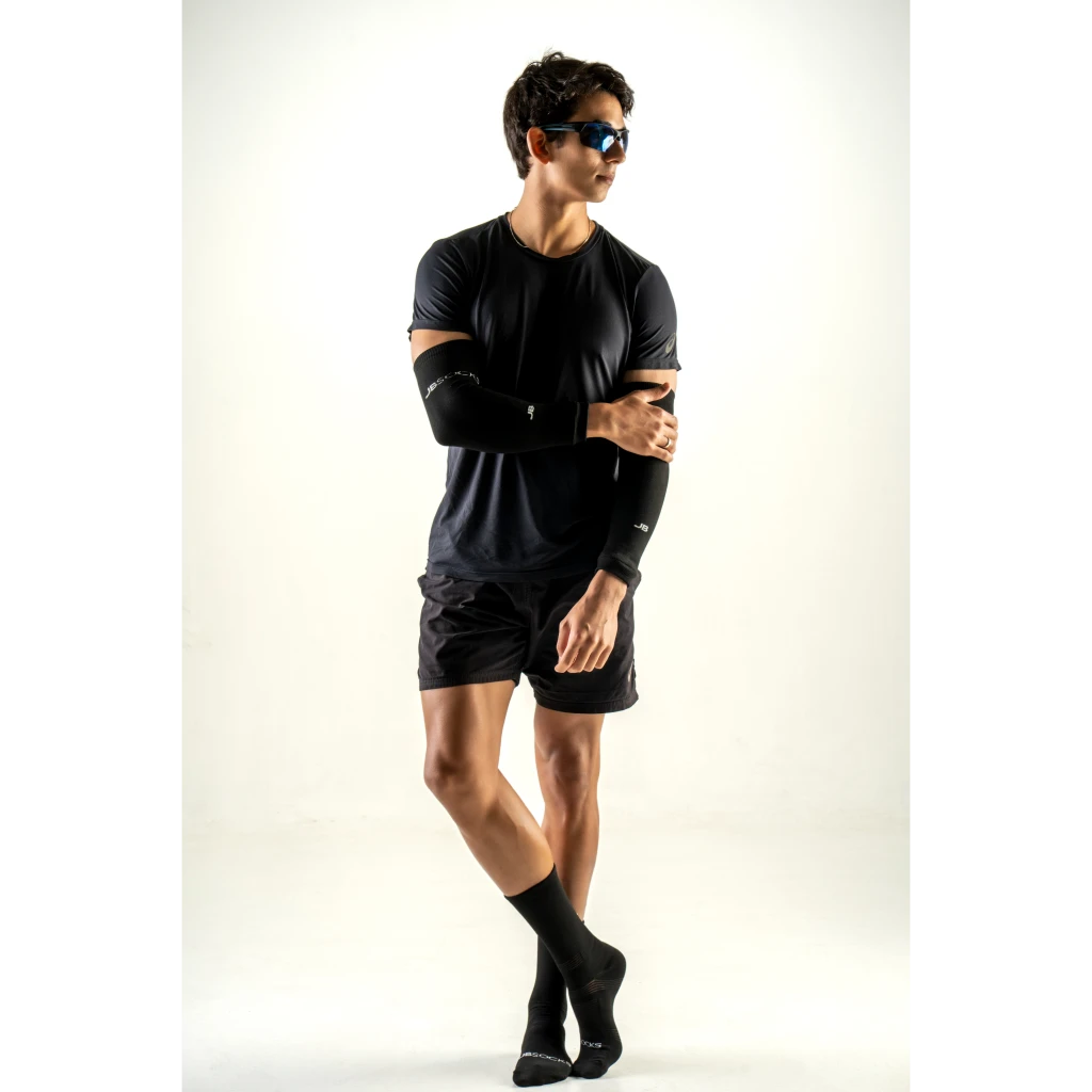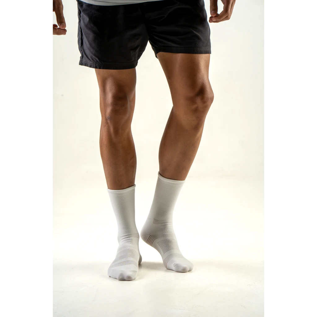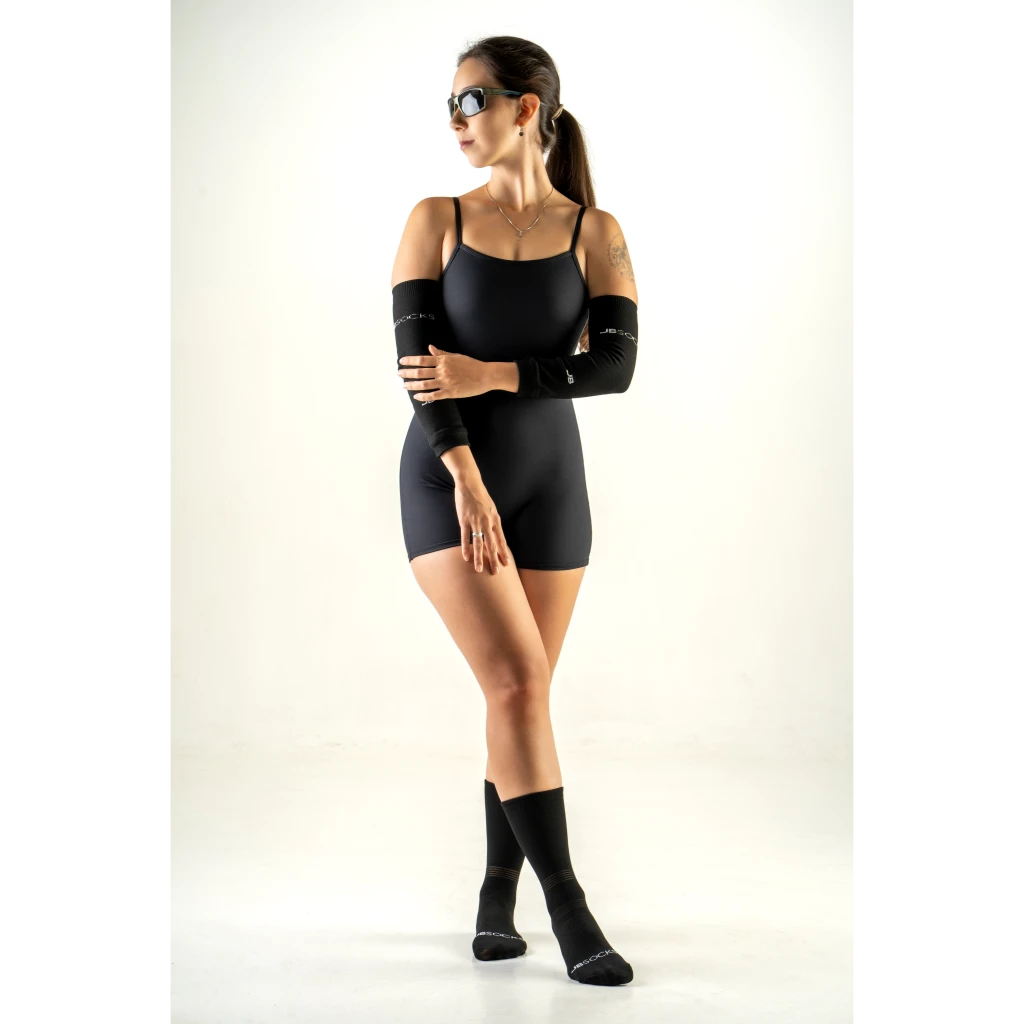 Meia de poliamida com tecnologia de respiração e manguito para compressão. Tudo combinando perfeitamente em preto ou branco total.