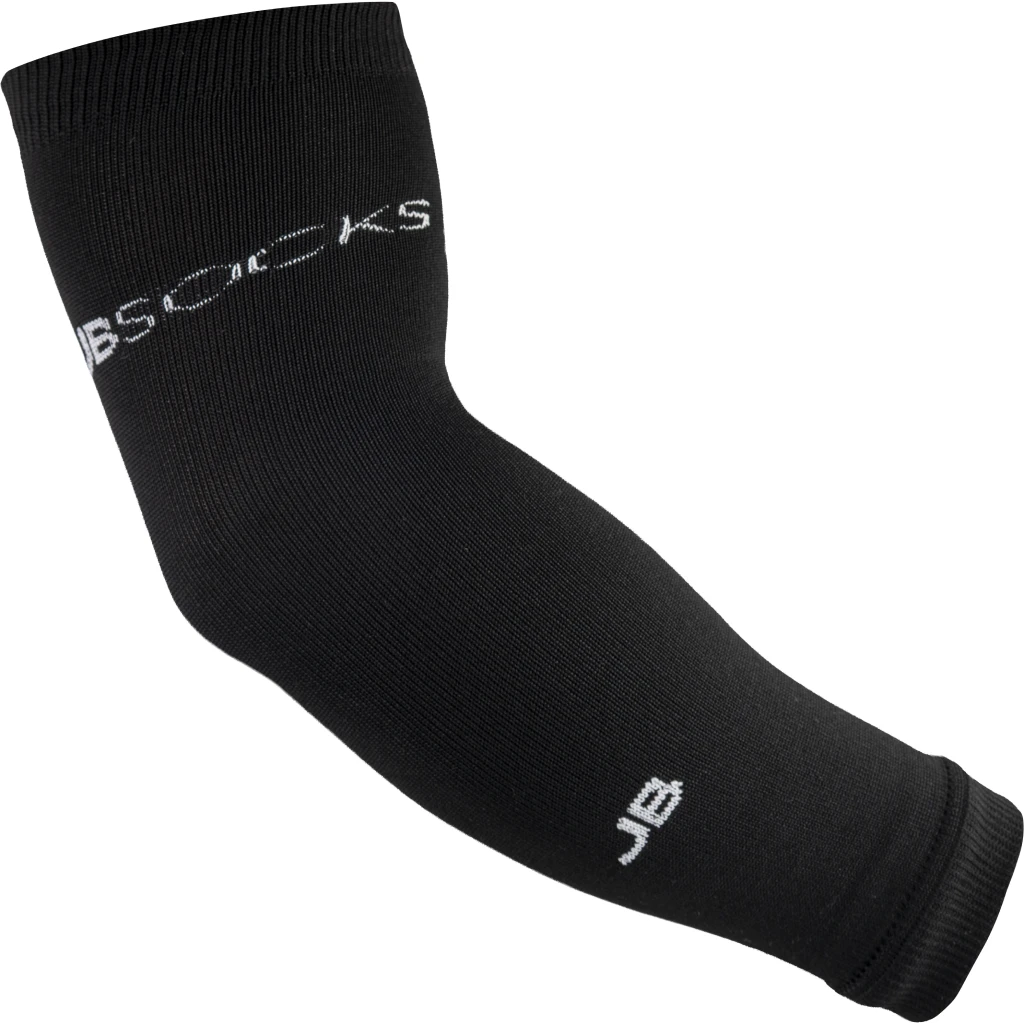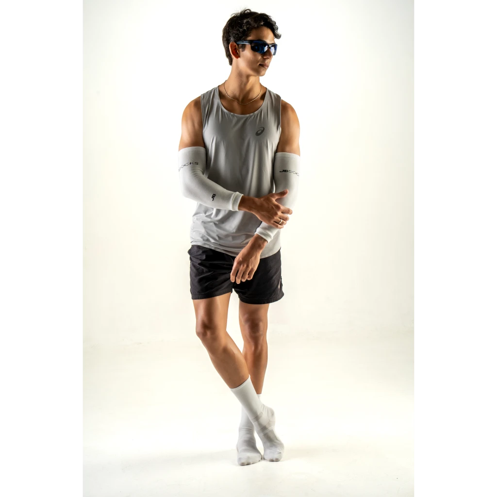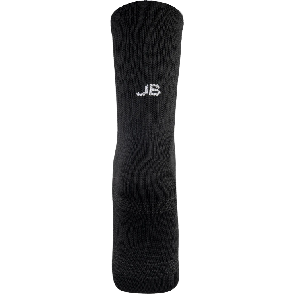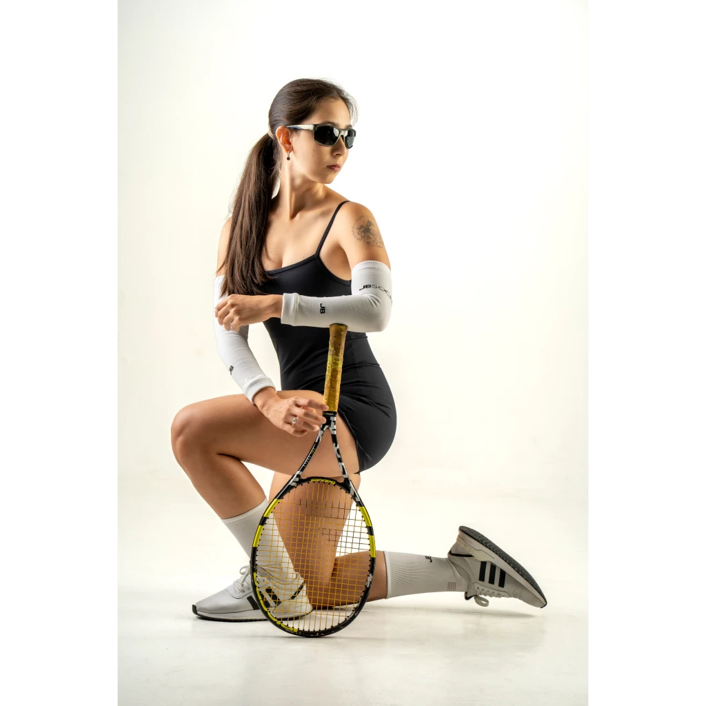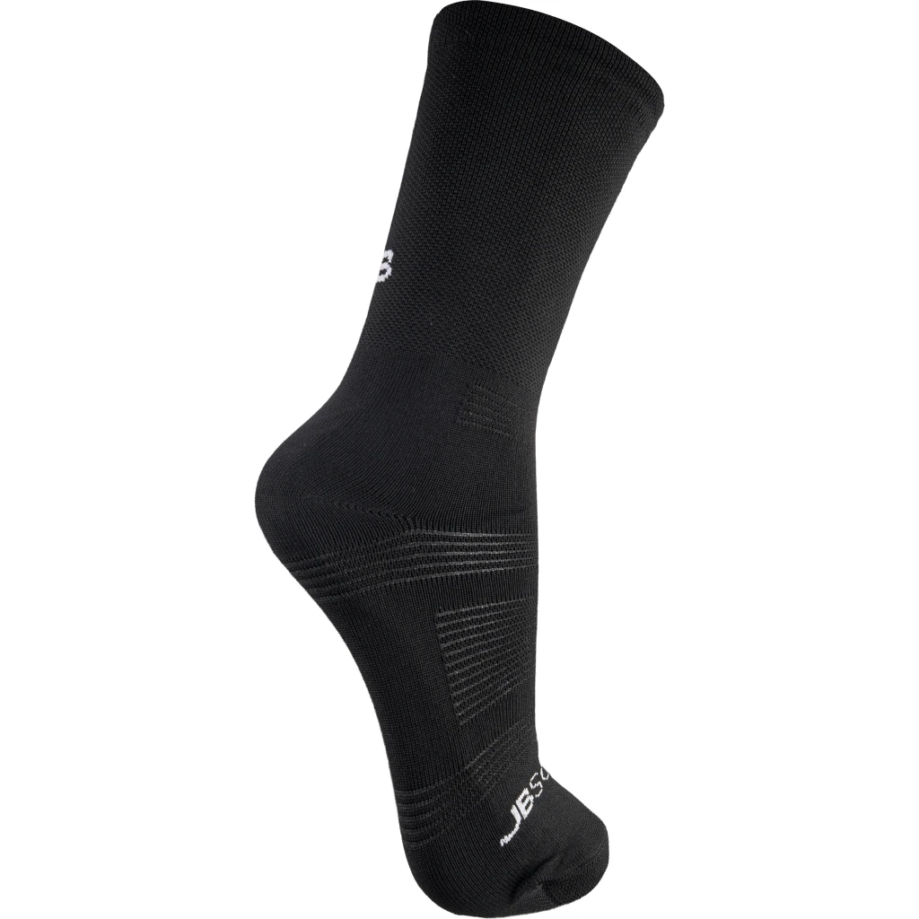 Meia de poliamida com tecnologia de respiração e manguito para compressão. Tudo combinando perfeitamente em preto ou branco total.