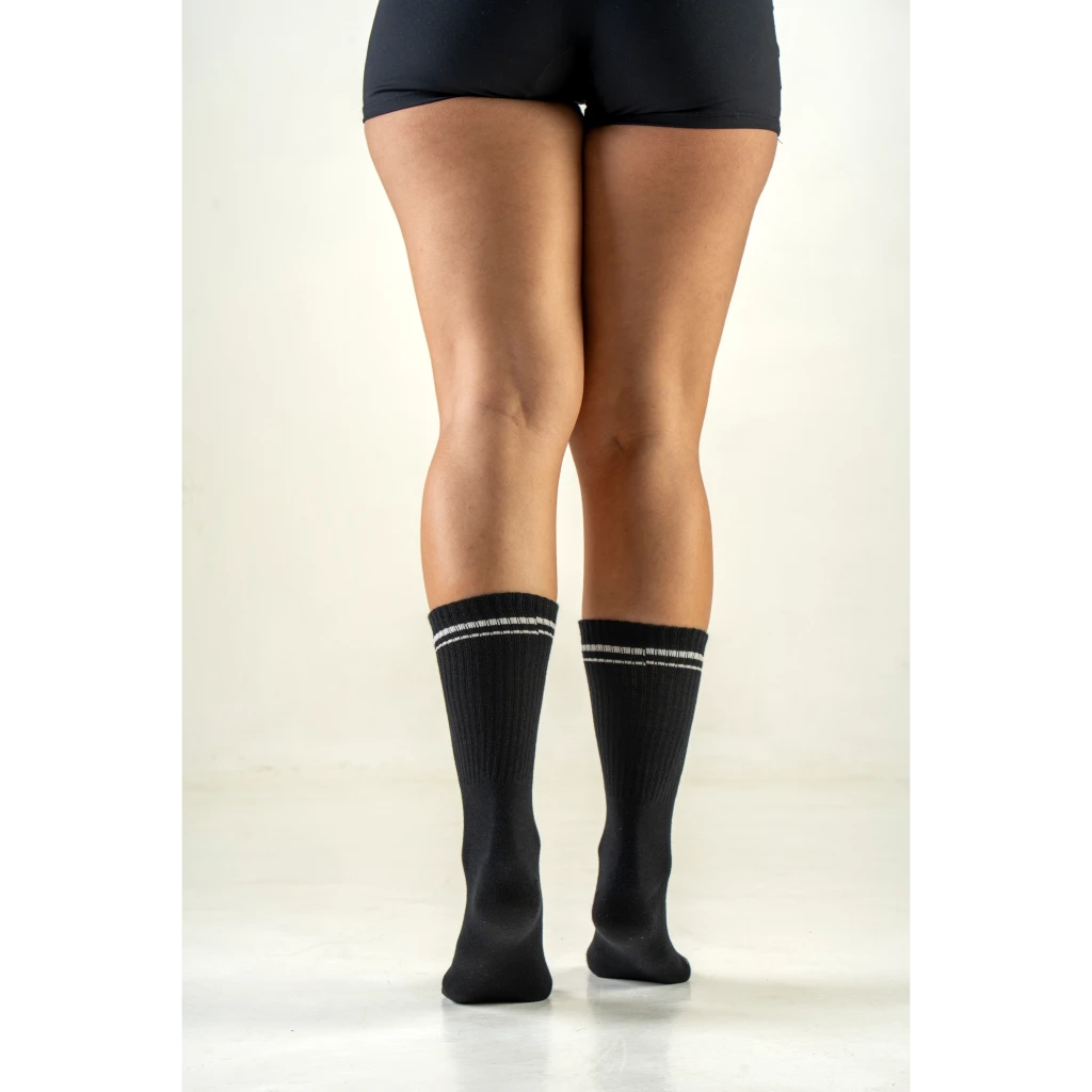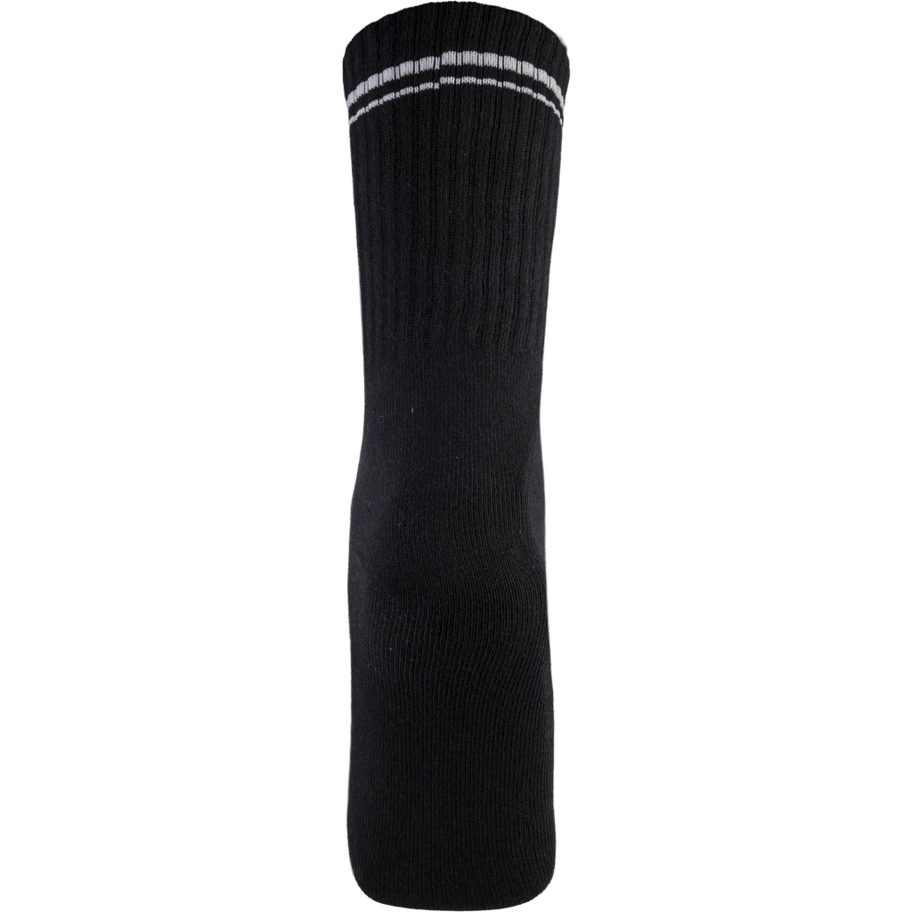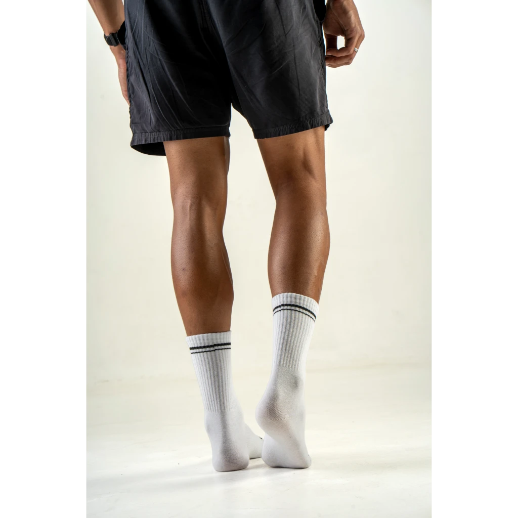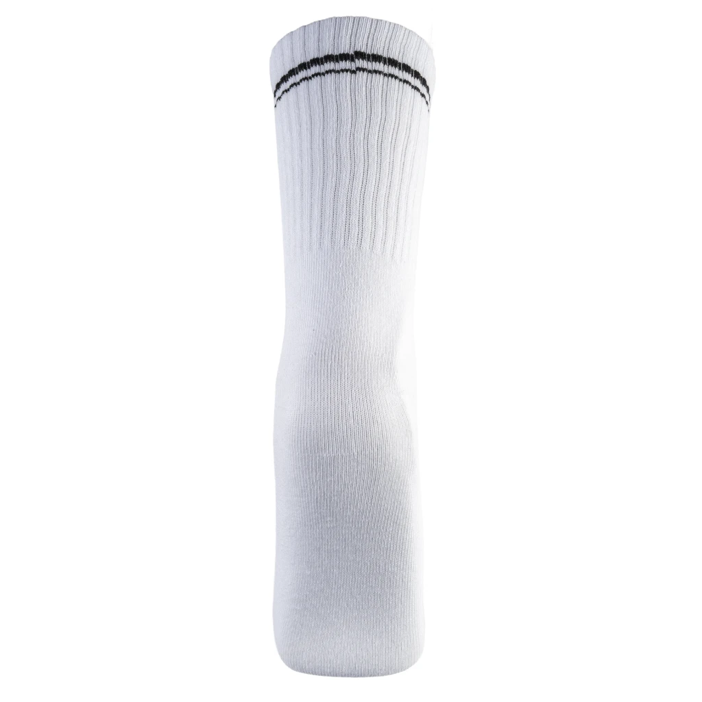 Kit com 3 pares de meias em algodão 100% (2 pretas + 1 branca) com design minimalista de uma linha grossa e uma linha fina no cano da meia.