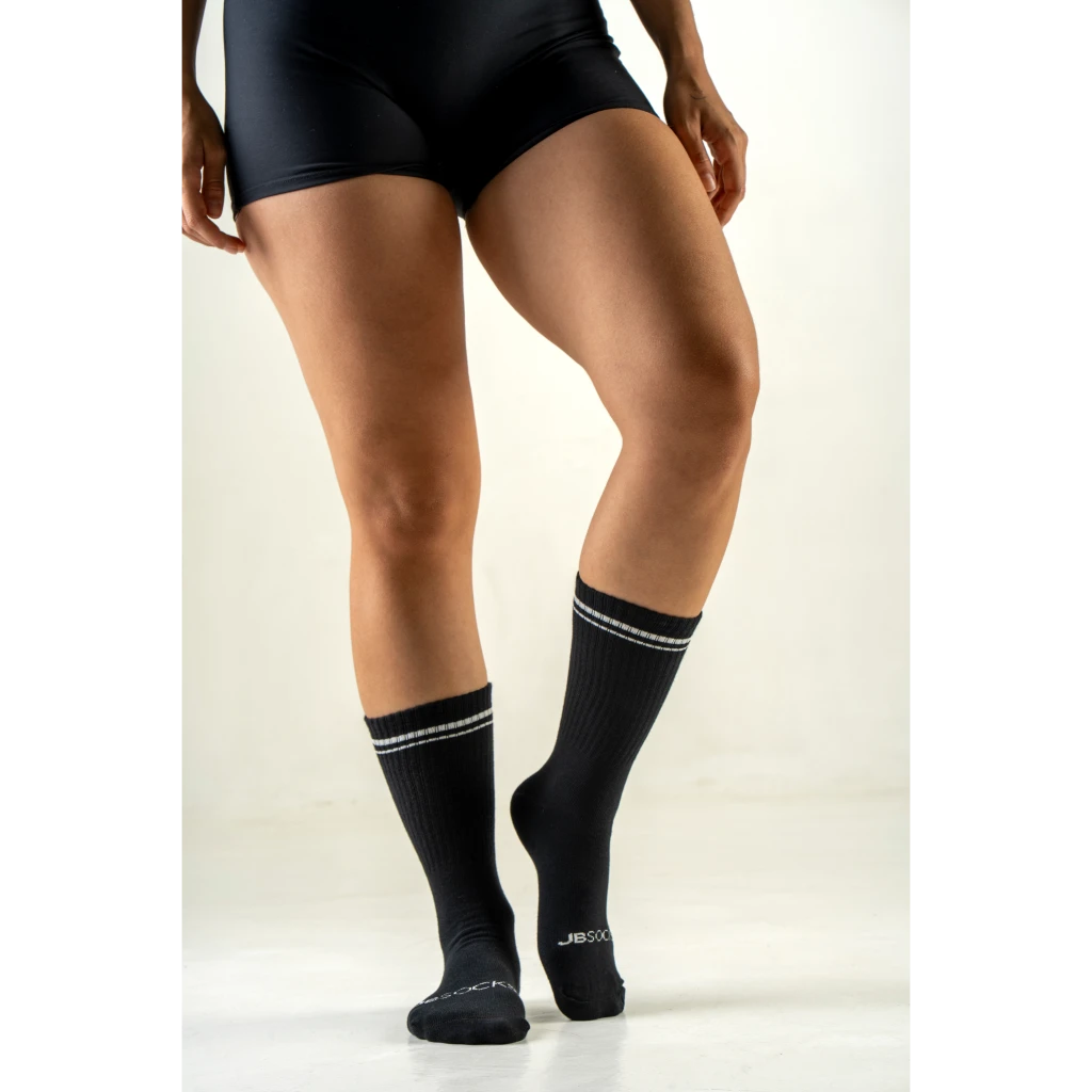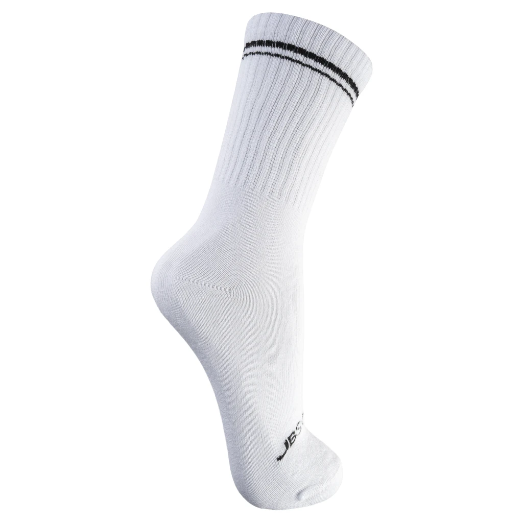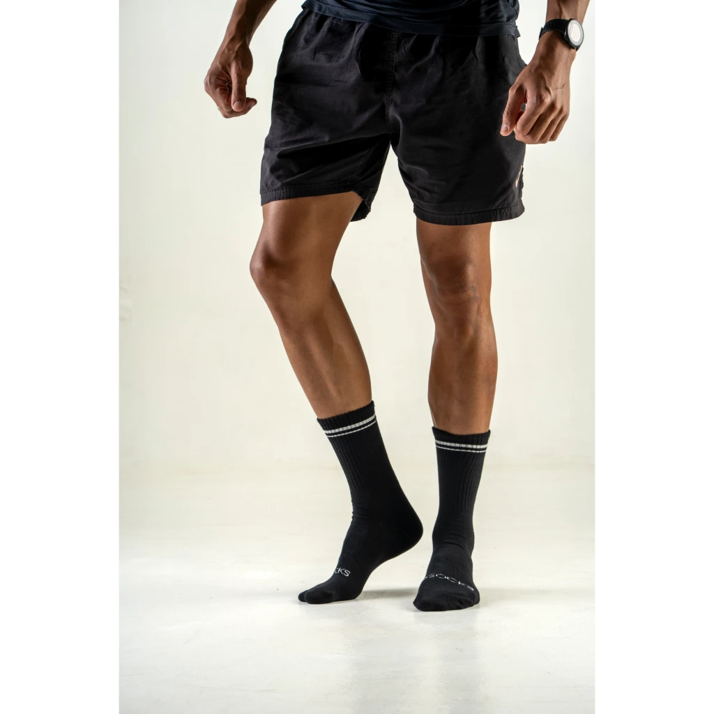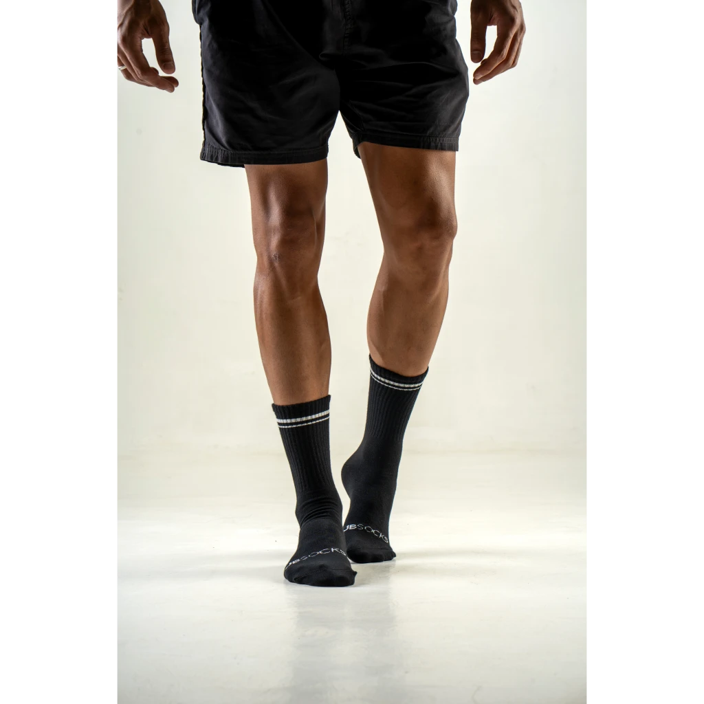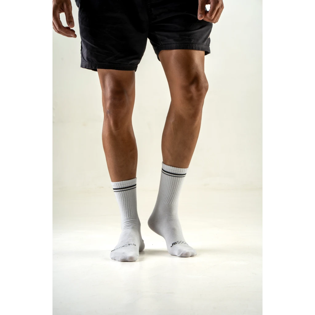 Kit com 3 pares de meias em algodão 100% (2 pretas + 1 branca) com design minimalista de uma linha grossa e uma linha fina no cano da meia.